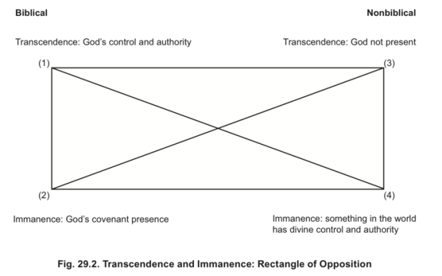 [John Frame’s ‘Rectangle of Opposition’ is a device used throughout his writings to show the antithesis between the biblical view of transcendence and immanence on the left side and the non-biblical view on the right. The diagonal lines represent direct contradictions, while the horizontal lines represent the similarity of language used in the two positions. The vertical line on the left represents the consistency of the biblical view whereas the vertical line on the left represents the tension within the non-biblical view.] #